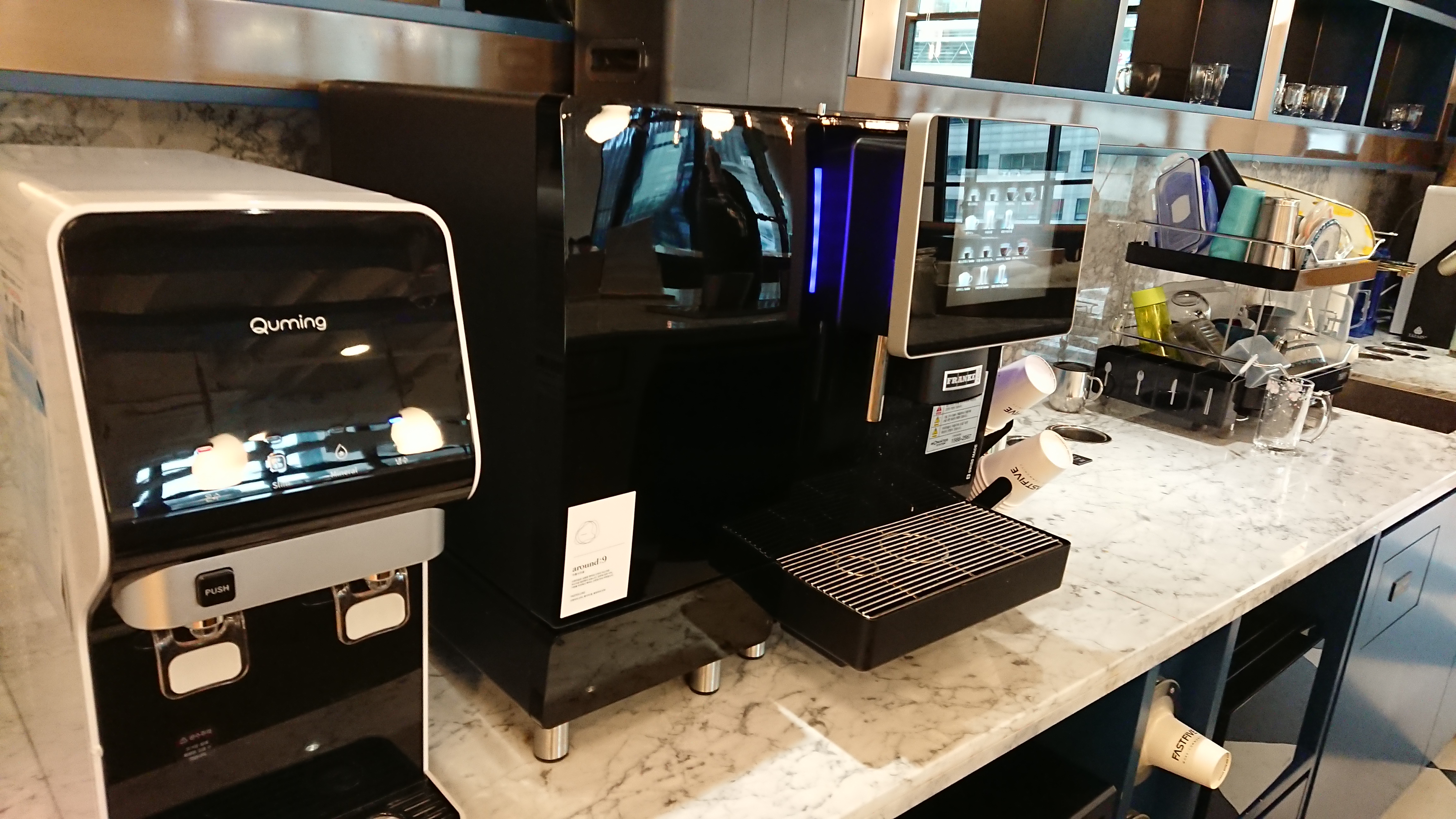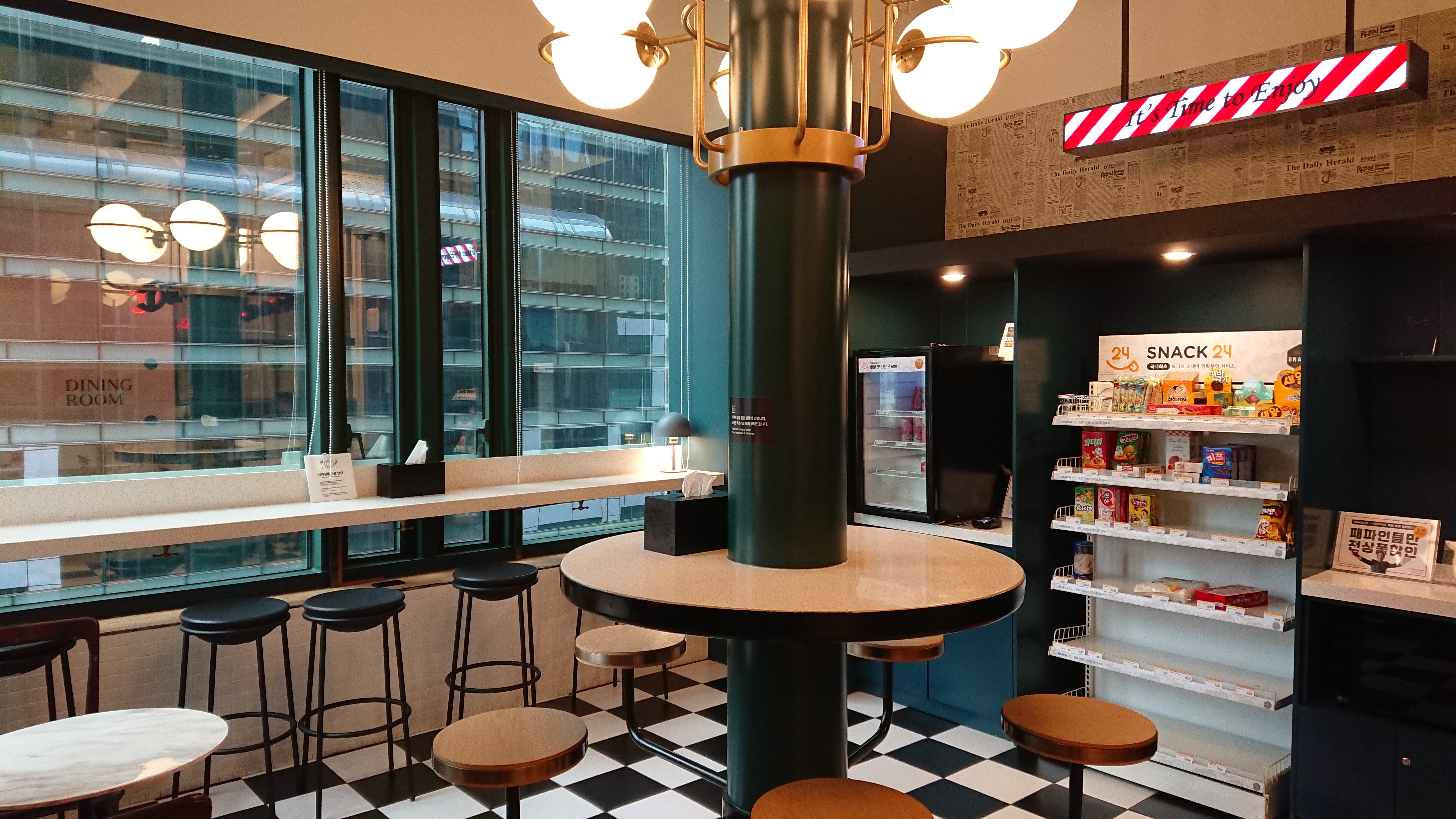 이곳은 매점 겸 음식을 먹을 수 있는 곳이다. 매점은 카드로 셀프(양심)계산이고 종목은 알아서 잘 바꿔준다. 금액대는 높지 않다. 편의점보다 싸다. 그리고 음식의 경우 냄새 문제때문에 이곳과 각자의 사무실에서만 먹을 수 있다. 라운지 공간 사진을 찍지 못했지만 그 공간이 정말 거기 앉아서 이것저것 먹고 싶게 하는 그런 분위기도 좀 있다. 막 무조건 편하고 아늑한 것은 아니지만 그만큼 공간을 잘 꾸며놓았다는 얘기다.