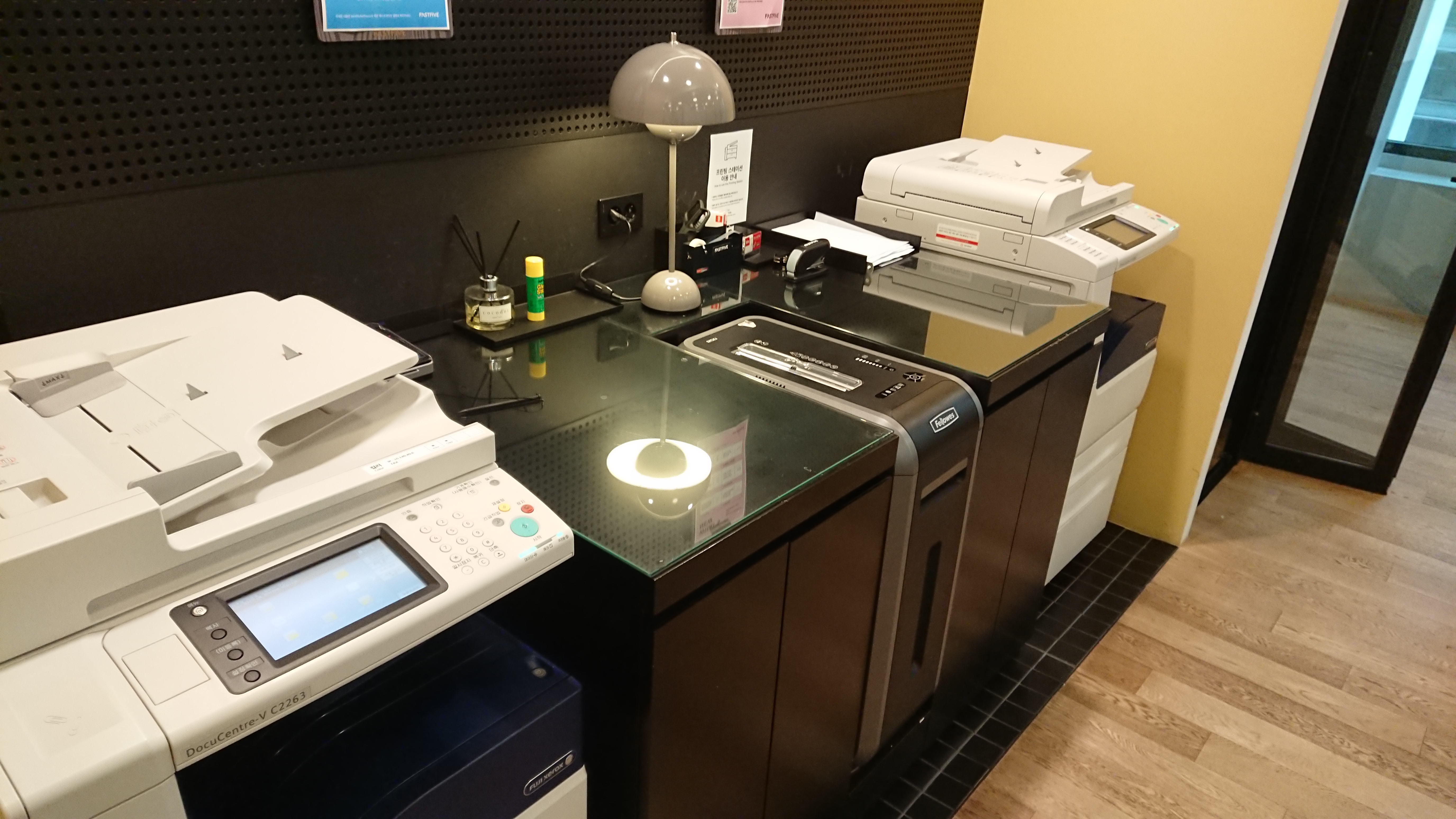 이곳은 일종의 OA공간이다. 흑백 프린트와 복사는 무제한이고 컬러는 돈을 내야하는데 값이 그렇게 비싸지는 않지만 절차가 꽤나 복잡하고 어렵다. UX적인 측면에서는 꽝이다. 문서 파쇄기는 튼튼한 것으로 있어서 아주 잘 갈아준다. 그리고 저 공간 양 옆으로 전화통화 부스가 있다. 좀 덥다.